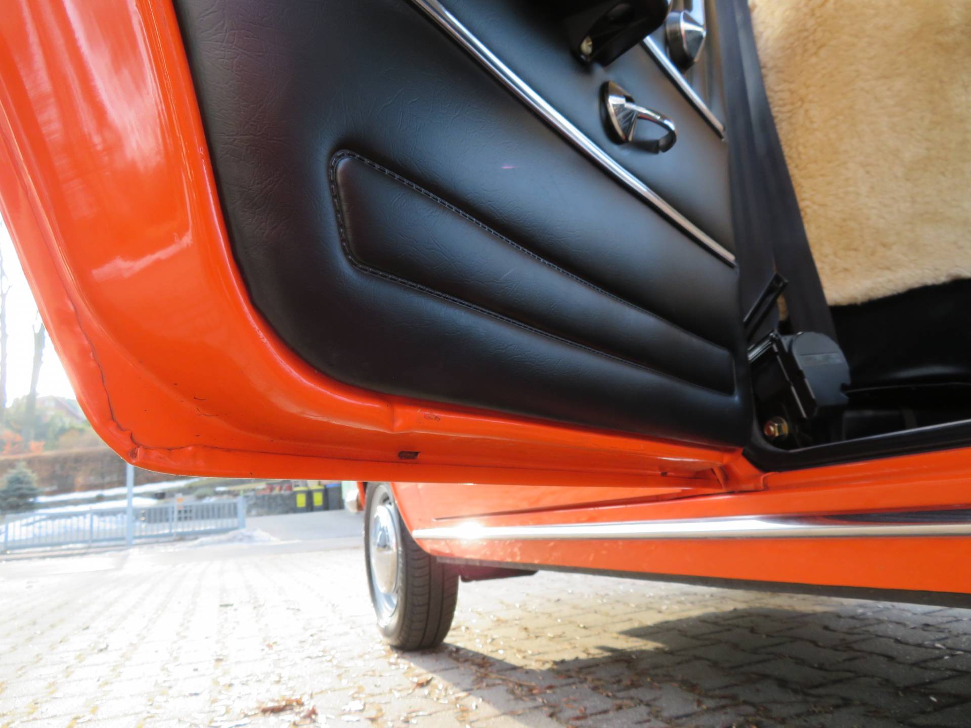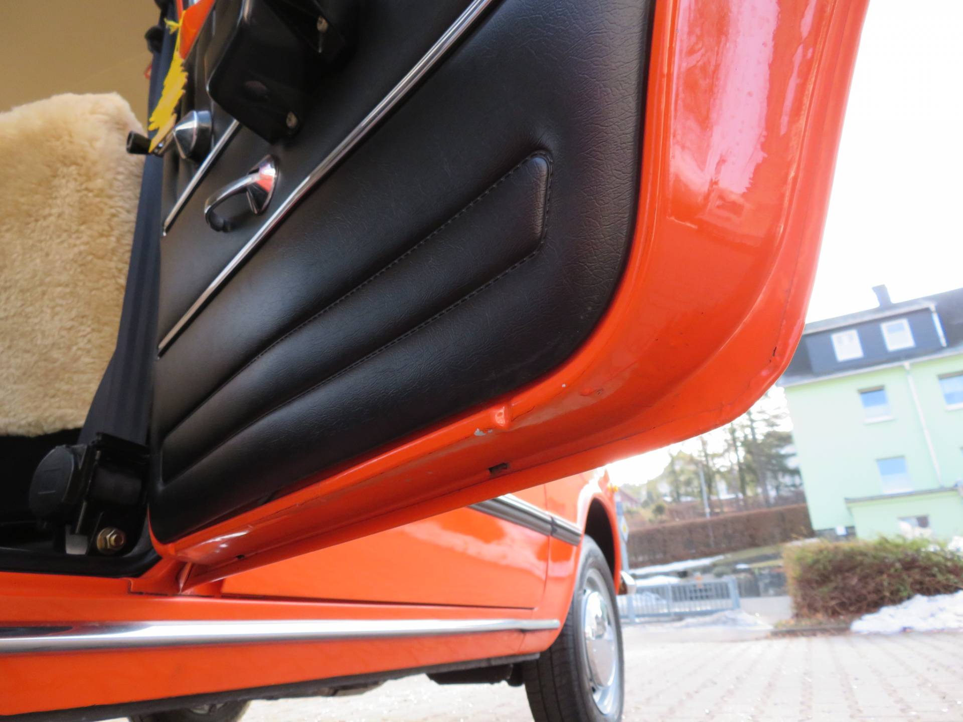 Abgesehen von wirklich winzigen Spuren der Zeit u. Nutzung, die man mit der Lupe suchen muß, ist der Wagen innen wie außen mit einem dreijährigen Jungwagen zu vergleichen. Die 20400km sind zwar nicht belegbar aber unsere 20 jährige Erfahrung sagt uns, die Laufleistung ist durchaus glaubhaft. Das Lenkrad ist nicht spröde, die Sitzpolster sind neuwertig, der Gummiteppich, die Türverkleidungen, das Armaturenbrett und der Himmel ebenso. Der Motorraum ist neuwertig, keine Verätzungen von ausgelaufenen Batterien, keine Leckagen! Äußerlich stimmen alle Spaltmaße, die Beleuchtung u. Verglasung, insbesondere die Frontscheibe ist frei von Beschädigungen. Chrom, Zierleisten und Dichtungen, v.a. an den Scheiben sind wie neu. Der Scheibenkeder ist nicht vergilbt.  Viele kleine Details eben, die das Bild rund machen.