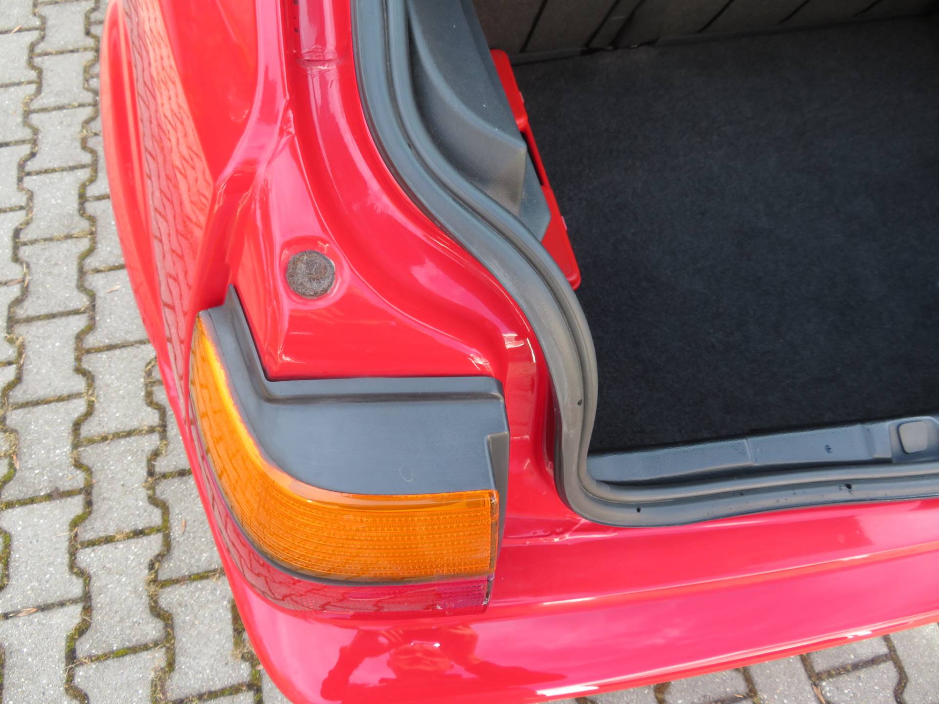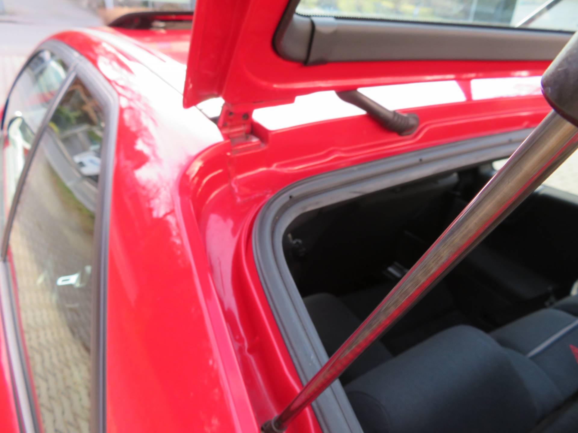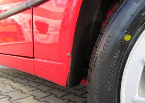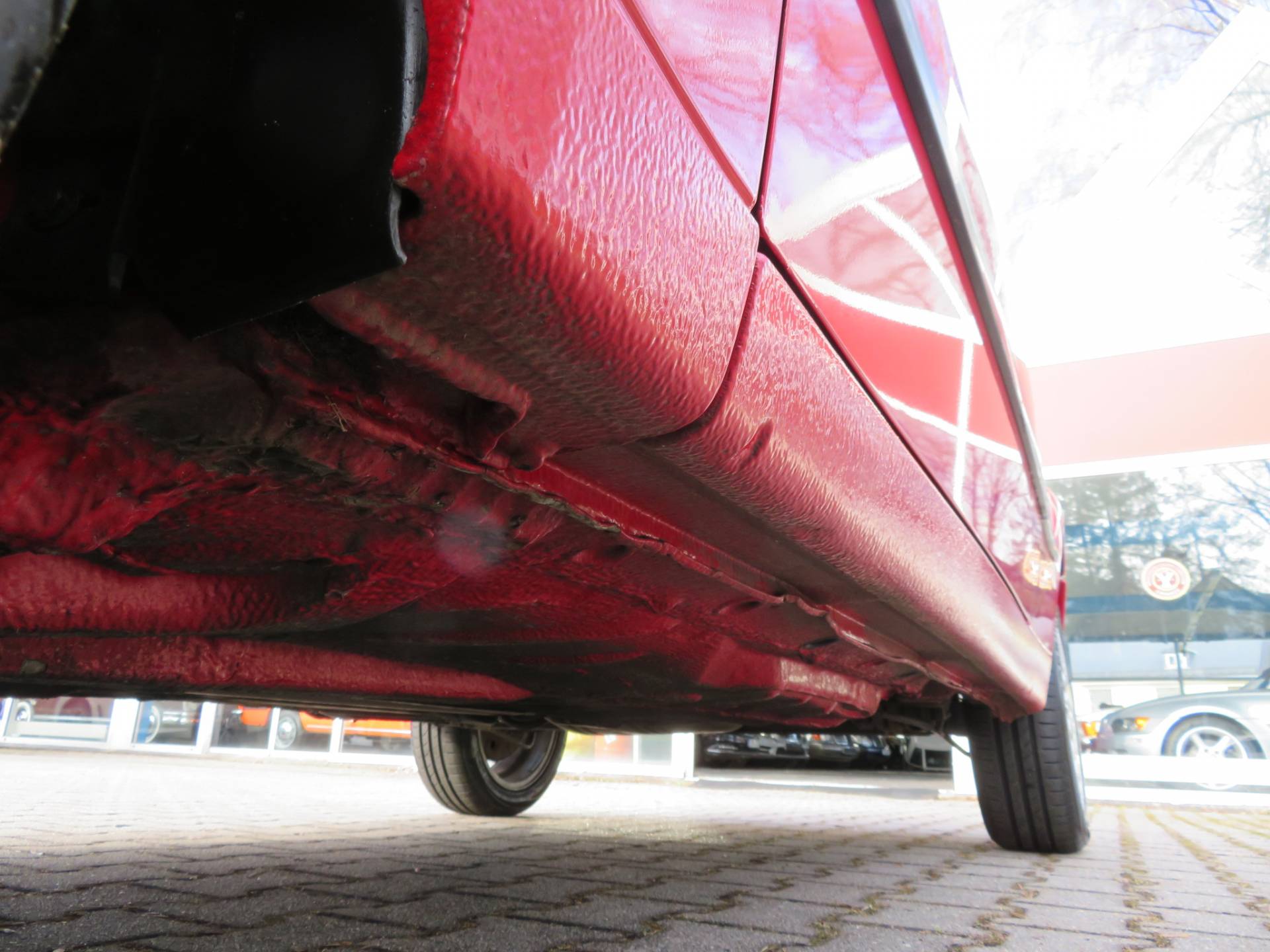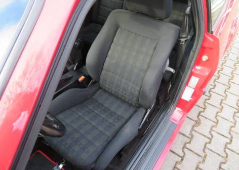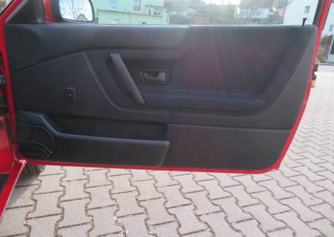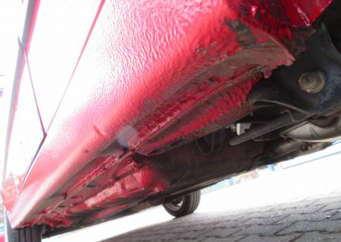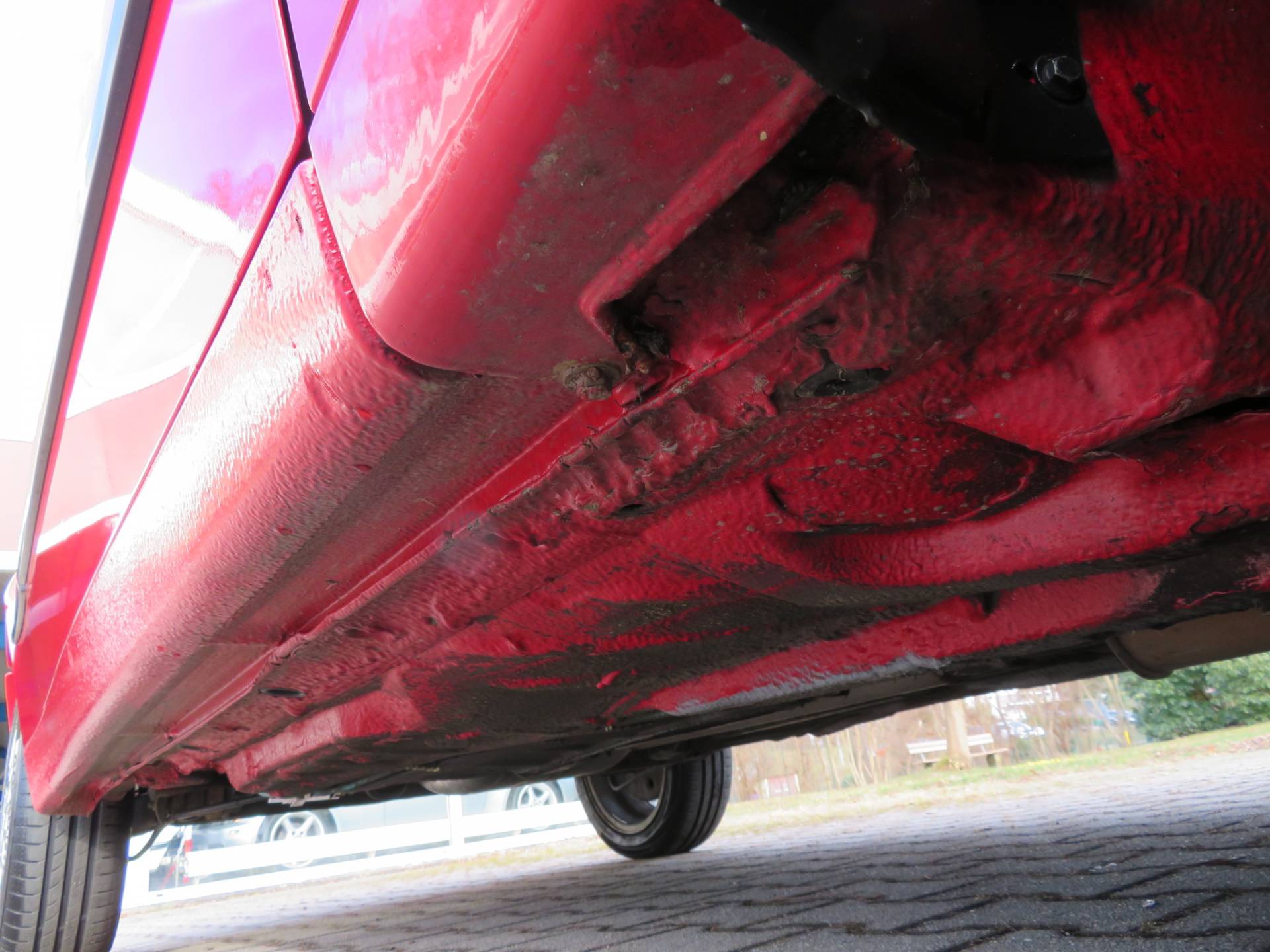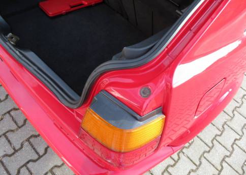 Äußerlich präsentiert sich der VW in sehr schönem Zustand ohne nennenswerte Gebrauchspuren oder Schäden. Es gibt weder grobe Kratzer, Beulen, Dellen o. Steinschläge, der Lack glänzt noch sehr schön, das lässt auf Garagenhaltung schließen da rote Lacke meist blind werden. Die Felgen sind tadellos, Beleuchtungsgläser und Scheiben sind unbeschädigt, Stoßstangen nicht angefahren, der Unterboden ist weitgehend sauber und rot wie ab Werk. Dichtungen und Plastikanbauteile sind nicht spröde und matt. Lediglich der Frontspoiler hat zwei kleine Anfahrisse. Ein echter Hingucker!