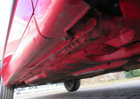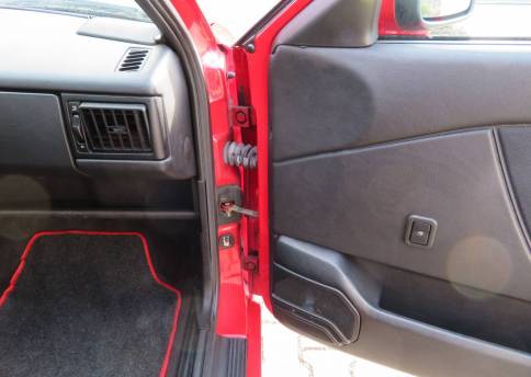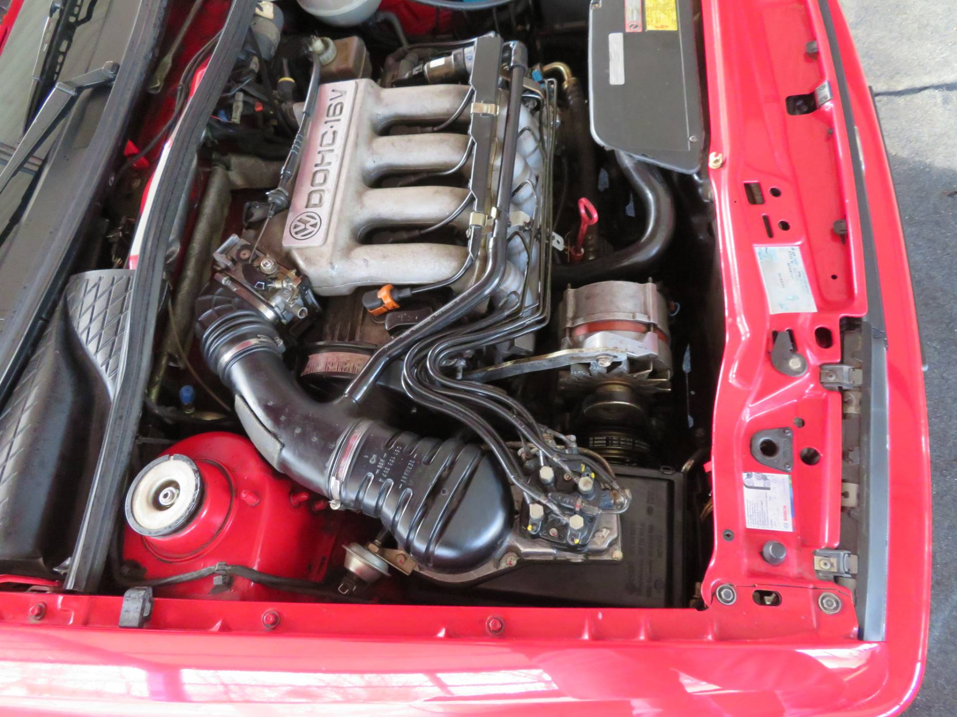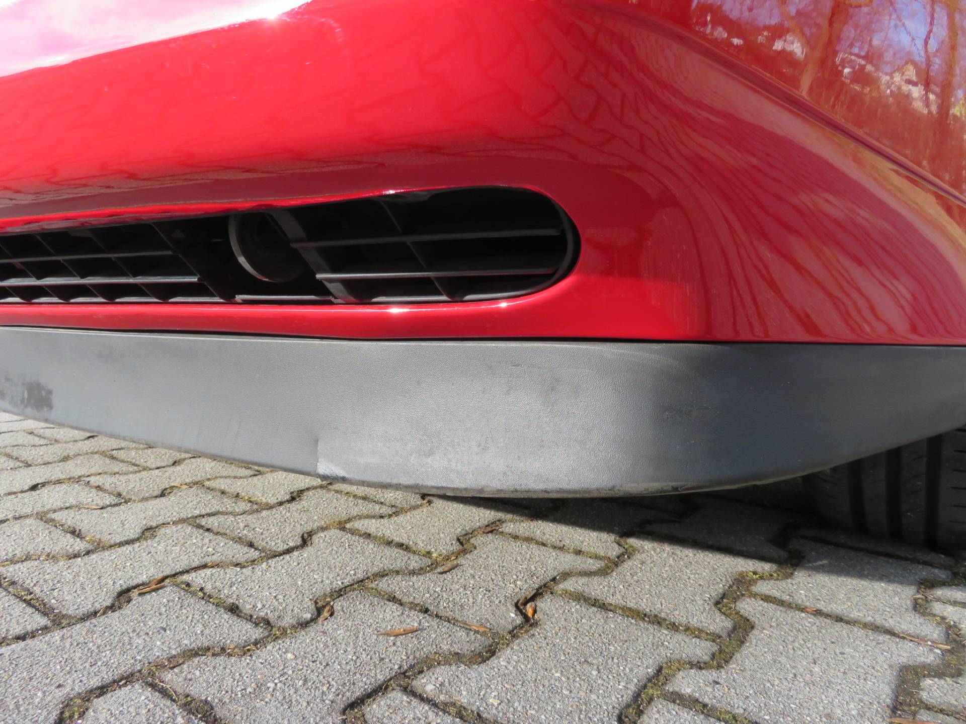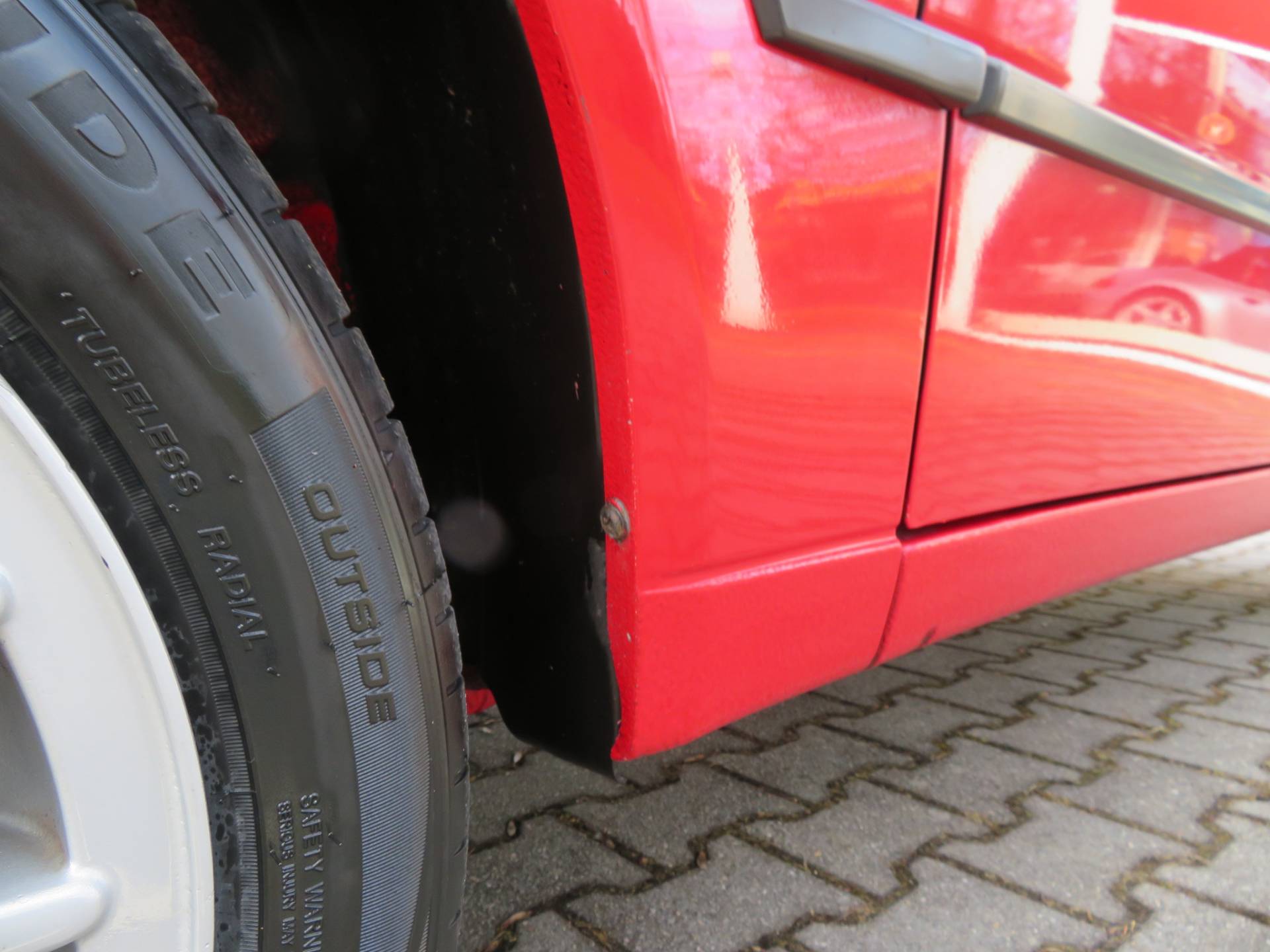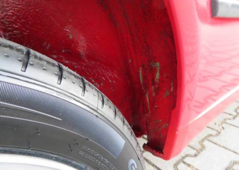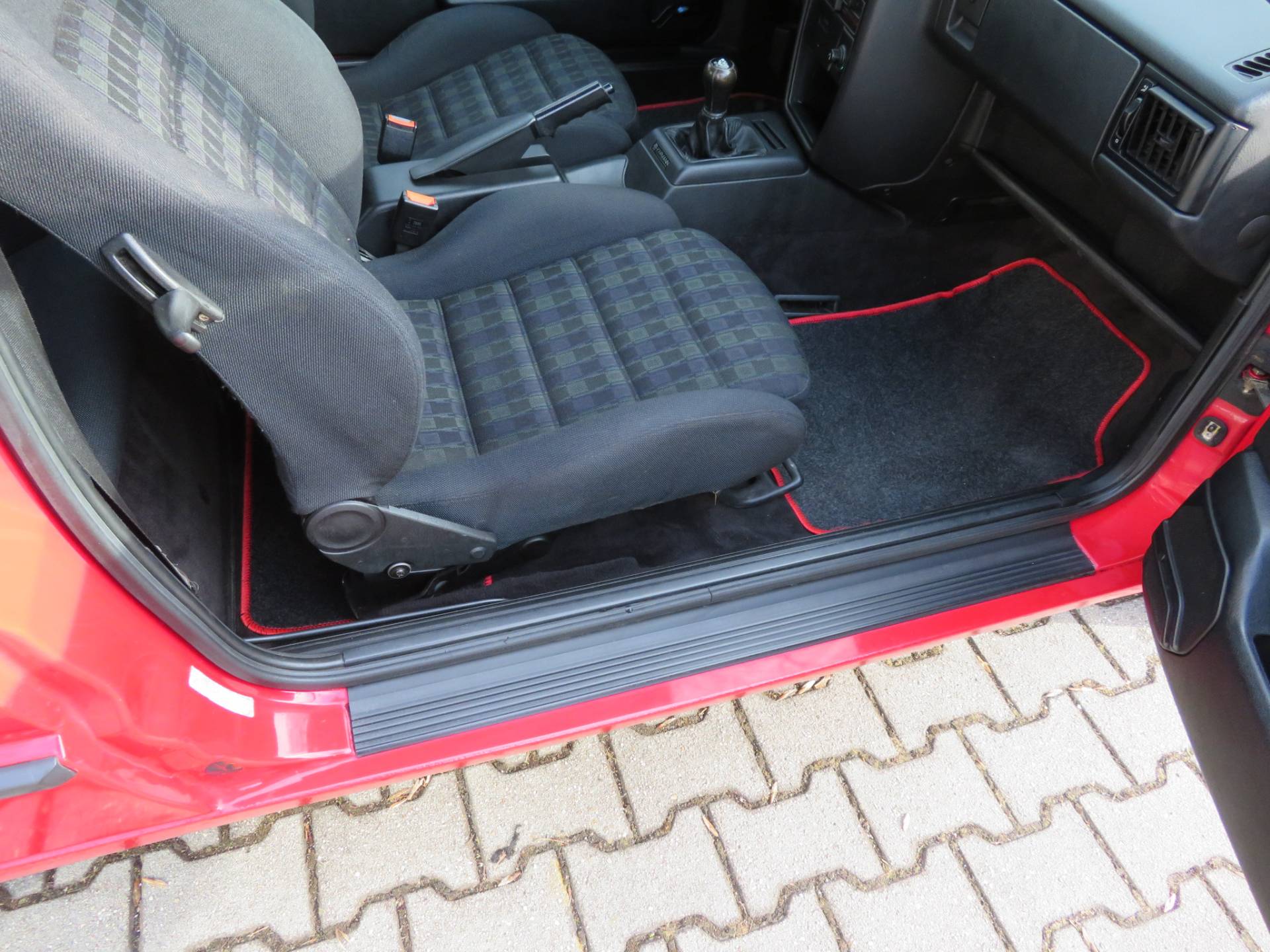 Äußerlich präsentiert sich der VW in sehr schönem Zustand ohne nennenswerte Gebrauchspuren oder Schäden. Es gibt weder grobe Kratzer, Beulen, Dellen o. Steinschläge, der Lack glänzt noch sehr schön, das lässt auf Garagenhaltung schließen da rote Lacke meist blind werden. Die Felgen sind tadellos, Beleuchtungsgläser und Scheiben sind unbeschädigt, Stoßstangen nicht angefahren, der Unterboden ist weitgehend sauber und rot wie ab Werk. Dichtungen und Plastikanbauteile sind nicht spröde und matt. Lediglich der Frontspoiler hat zwei kleine Anfahrisse. Ein echter Hingucker!