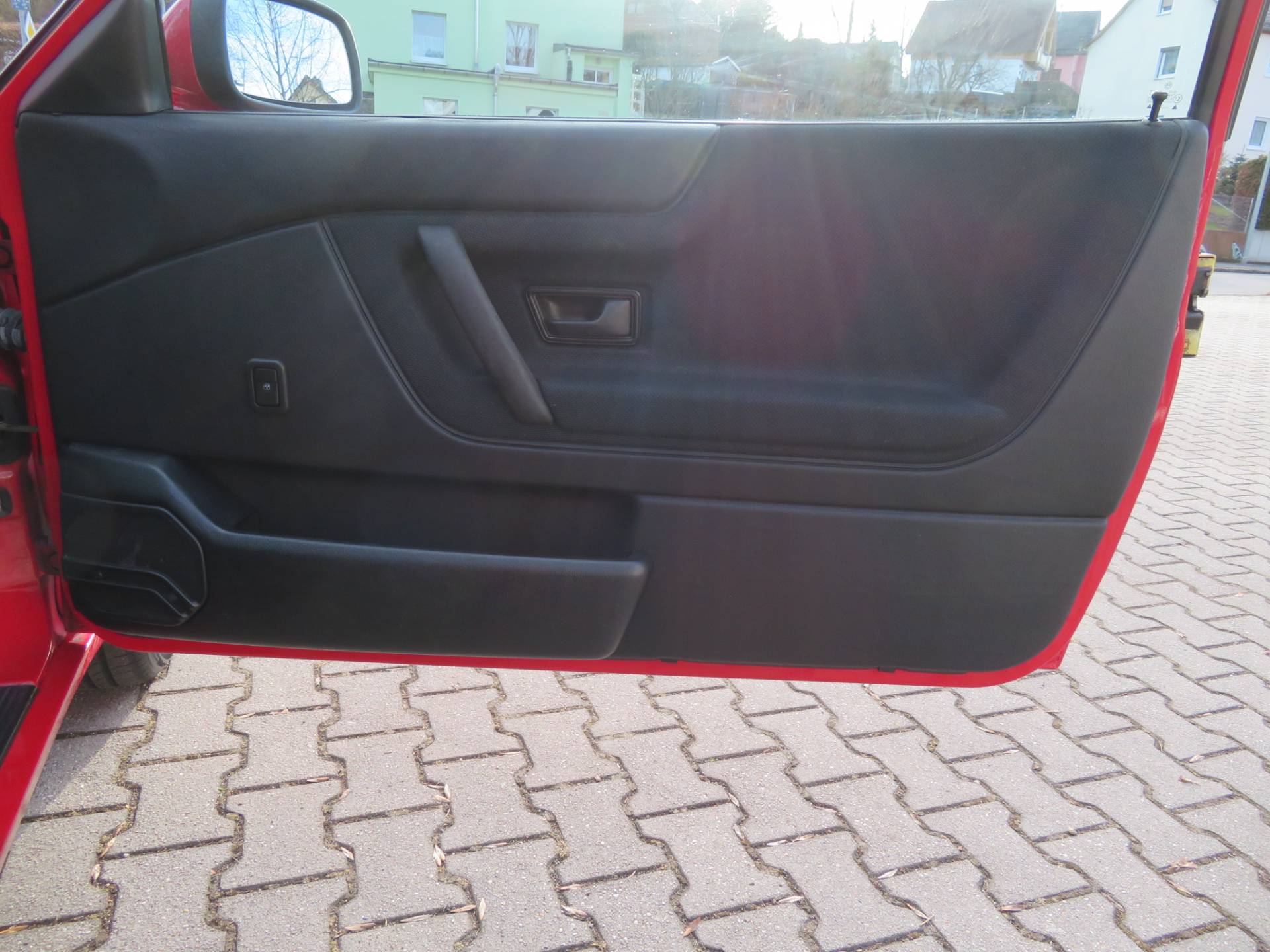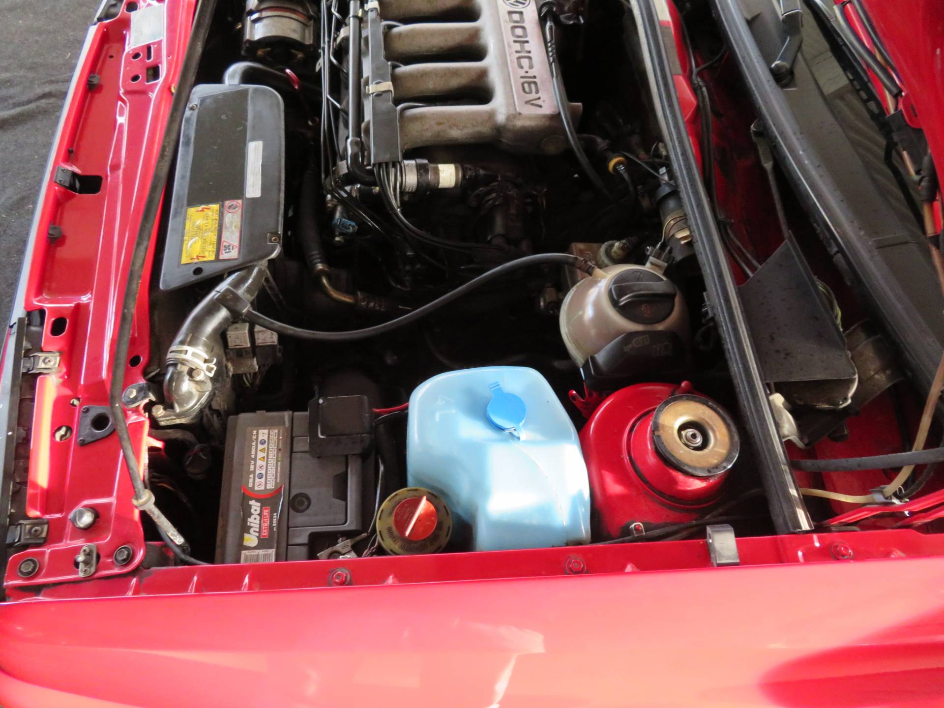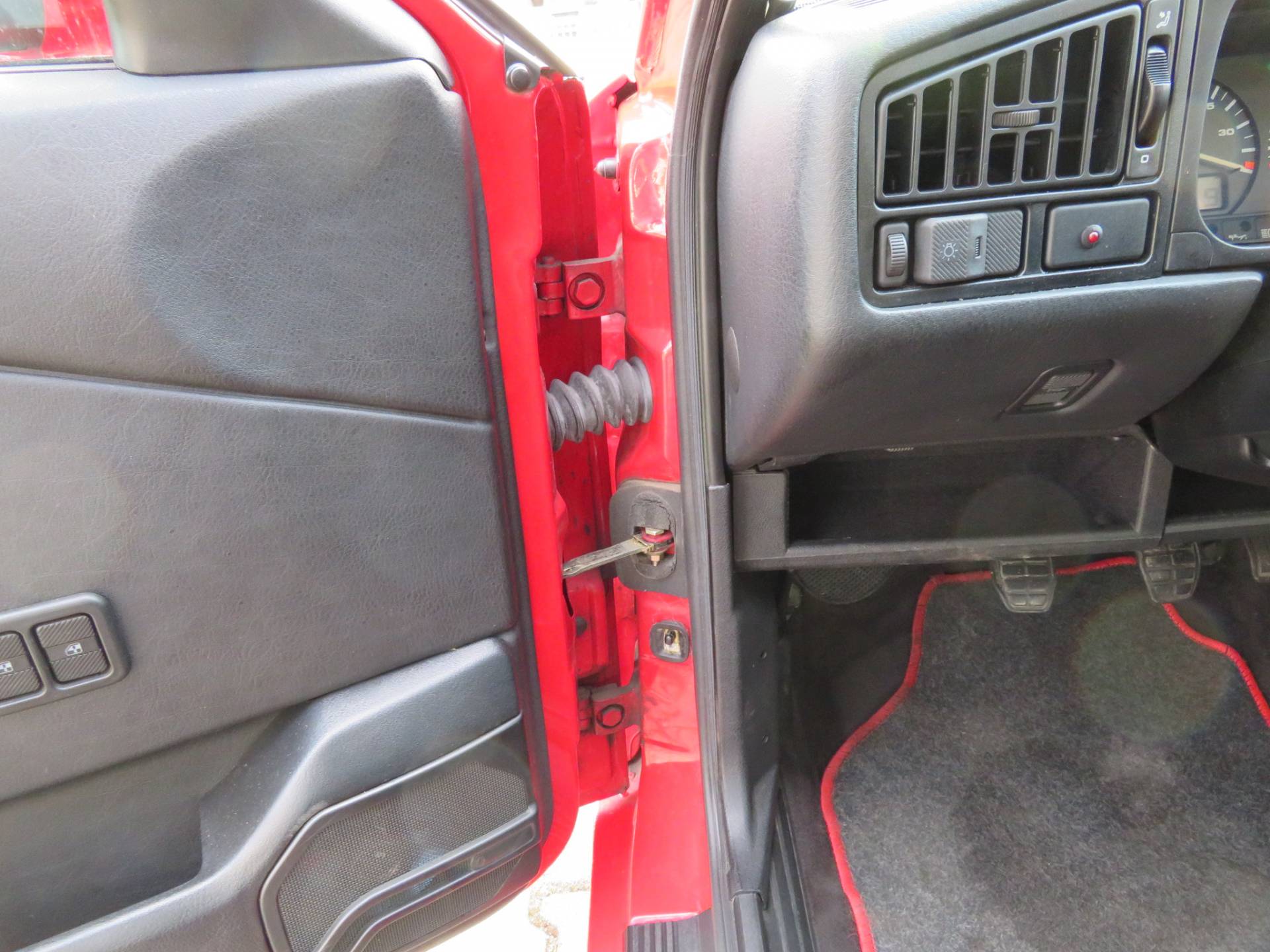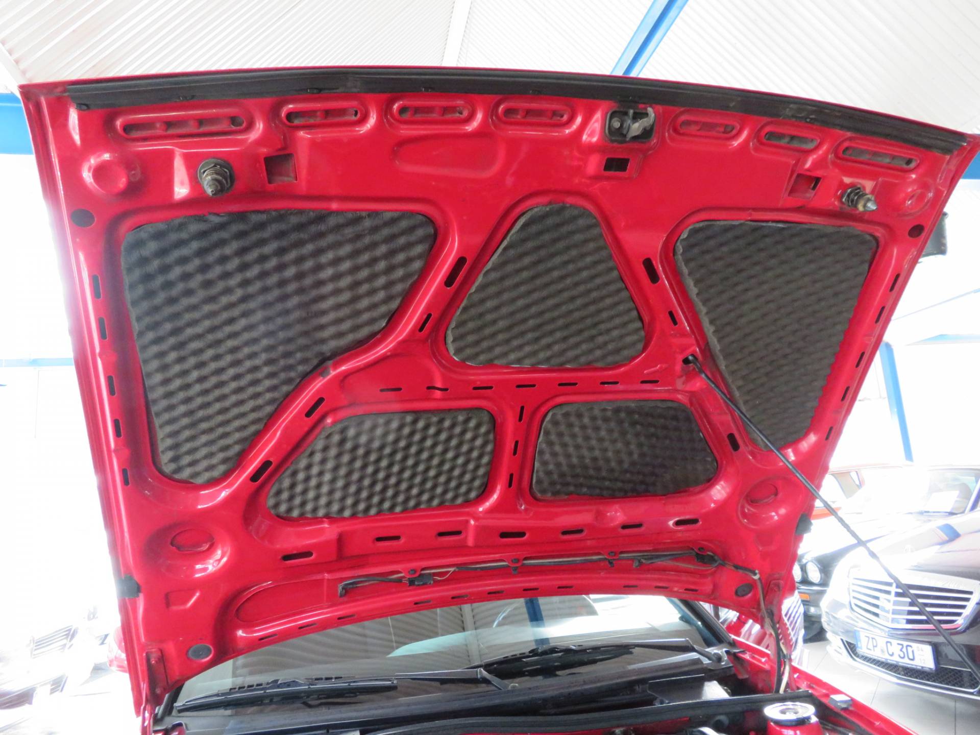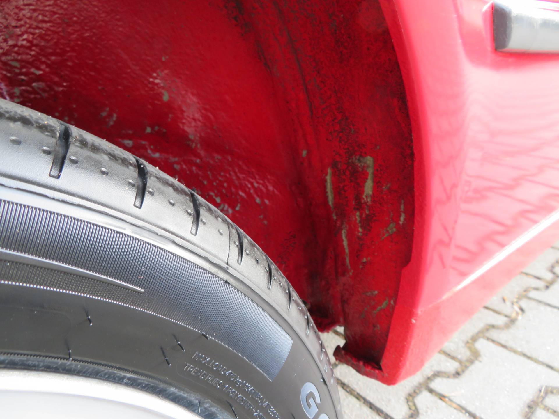 Äußerlich präsentiert sich der VW in sehr schönem Zustand ohne nennenswerte Gebrauchspuren oder Schäden. Es gibt weder grobe Kratzer, Beulen, Dellen o. Steinschläge, der Lack glänzt noch sehr schön, das lässt auf Garagenhaltung schließen da rote Lacke meist blind werden. Die Felgen sind tadellos, Beleuchtungsgläser und Scheiben sind unbeschädigt, Stoßstangen nicht angefahren, der Unterboden ist weitgehend sauber und rot wie ab Werk. Dichtungen und Plastikanbauteile sind nicht spröde und matt. Lediglich der Frontspoiler hat zwei kleine Anfahrisse. Ein echter Hingucker!
