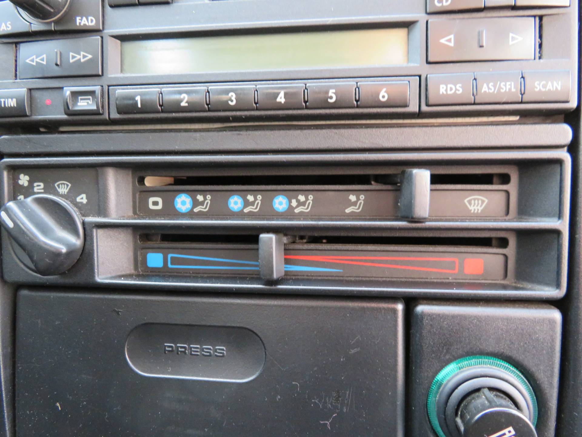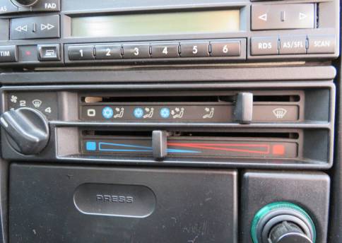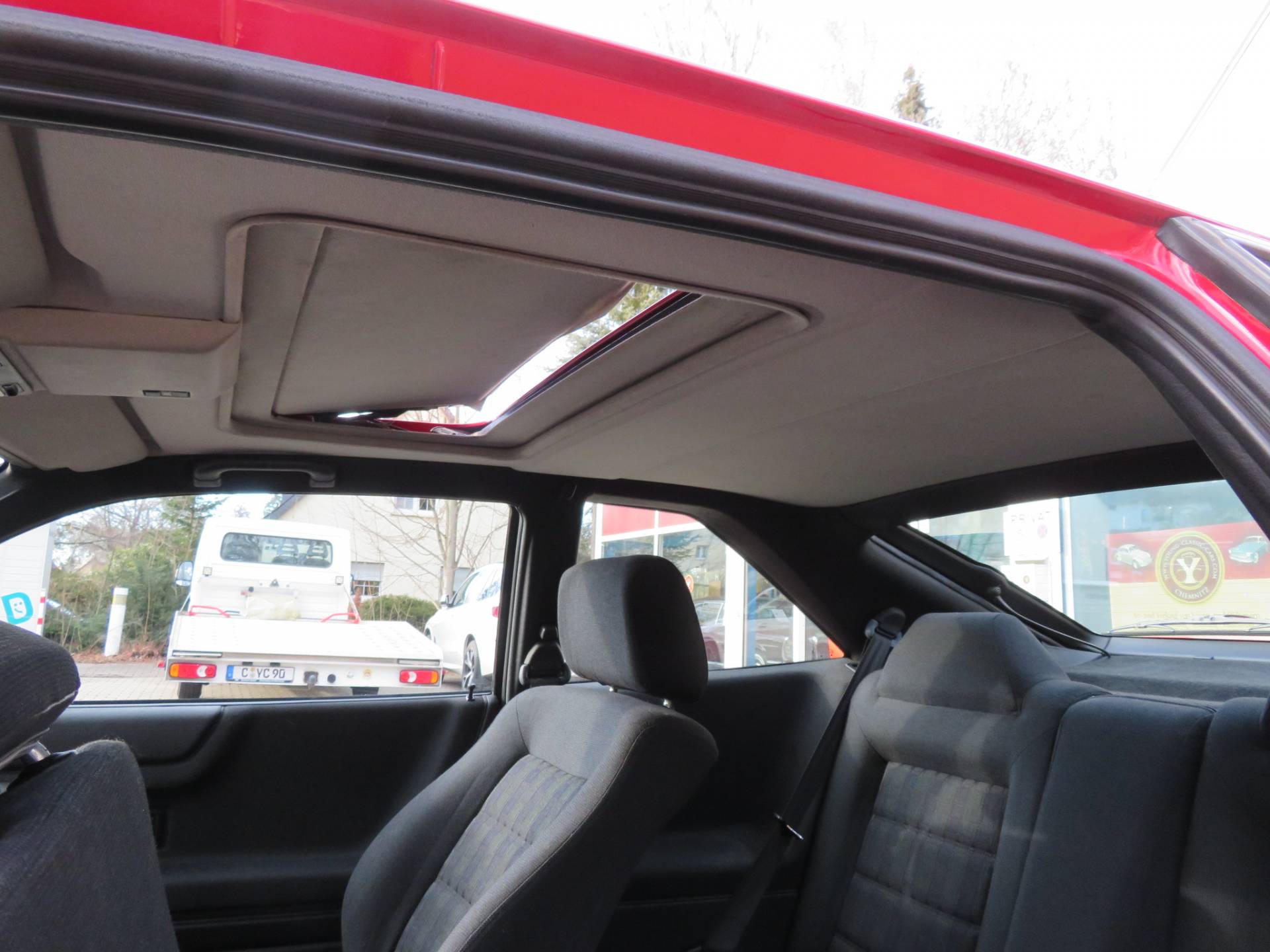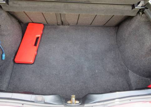 Im Innenraum geht es genauso gepflegt zu. Polster und Verkleidungen sind tadellos, das Armaturenbrett ist rissfrei, die Teppiche und der Himmel sind sauber, der Himmel löst sich nicht ab (lediglich am SSD- Deckel beginnen leichte Ablösungen an den Rändern), das Lederlenkrad ist nur wenig abgegriffen, alle Schalter und Knöpfe wirken kaum benutzt, die Polster sind straff, alles sieht frisch aus und erfreut das Auge und die Hände. Der Geruch ist neutral. Im Kofferraum befindet sich noch der Typen- u. Lackaufkleber. Auch hier setzt sich der gepflegte Eindruck fort.